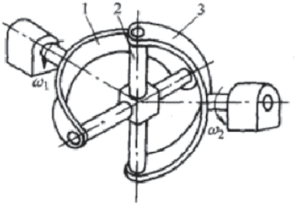 十字軸萬向聯(lián)軸器的結(jié)構(gòu)原理如圖2所示,主動軸、從動軸上的萬向節(jié)叉1、3中間的十字軸2分別以鉸鏈連接,當(dāng)兩軸有角位移時,萬向節(jié)叉1、3繞各自軸線回轉(zhuǎn),而十字軸則做空間運動。